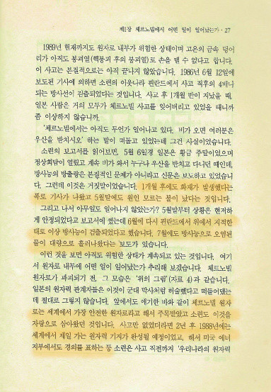 이 책은 체르노빌 사고를 감추기에만 급급한 세계의 핵산업계와 정부, 언론의 행태를 폭로하고 일본의 핵발전소의 안정성이 애초부터 불가능함을 알려준 책이다. 그러나 이 책은 오랫동안 기억에서 사라졌다. 굴업도 핵폐기장이나 부안 방폐장 문제와 같은 주요한 사건을 통해 핵의 위험성이 사회화된적도 있지만, 이미 텔레비전만 틀면 끊임없이 나오는 ‘안전한 원자력발전, 깨끗한 원자력발전’광고에 나 역시 익숙해져버렸다. 한해 100억 정도의 예산을 들여 온갖 채널을 통해 원자력을 홍보하는 원자력문화재단과 발전소나 방폐장을 유치지역에 현금을 풀겠다는 식의 유치작전이 사람들에게 먹혀들어간 것이다. 그래서핵발전소를 반대하는 나 조차도 핵발전을 이야기할 때엔 핵폐기물 이야긴 해도, 핵발전 그 자체의 위험성을 이야기하는 것은 뭔가 지나친 비약이다는 느낌이 들었었다. 수년동안 발전소는 안전하게 운영되고 있다고 이야기듣고, 지금 일본의 핵발전소 폭발상황에서도 우리는 안전하다는 저들의 이야기에 나도 어느새 세뇌되어있었음을 이 책을 다시 펼치며 고백하지 않을 수 없다.