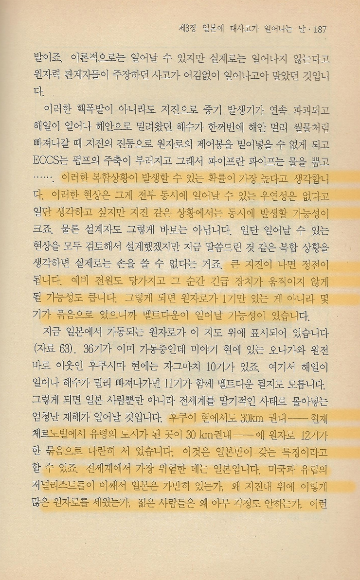 이 책의 3장 제목은 ‘일본에 대사고가 일어나는 날’이다. 미국과 소련에서는 이미 핵발전소 사고가 있었으므로 다음으로 원전이 많은 프랑스나 아니면 그다음인 일본에서 사고가 날 가능성을 언급하는 당시의 신문기사로부터 시작된다. 당시 일본의 과학기술청이 만든 비밀보고서에서 밝힌 ‘방사능의 백문의 일만 방출되어도 악조건에서는 3조 수천억엔이나 되는 피해가 발생하고, 죽음의 재가 한국까지 확산된다는 결론이 나와서’라는 글도 보여주고 있다. 도카이 핵발전소에서 사고가났을 경우 피해액 100조, 400만명의 피해, 일본 전역 방사능 확산 등 반핵단체가 아닌, 일본 정부가 작성한 보고서라는 것이 믿기지 않는 이야기다. 저자는 정부가 작성한 이런 보고서가 하나의 가설이 아닌, 실제 충분히 일어날 가능성이 있는 상황이고 이 사태를 불러일으킬 수 있는 이유로 ‘긴급노심냉각장치, 격납용기, 역악화와 출력이상, 지진’을 꼽았다. 2011년 바로 지금, 후쿠시마 핵발전소가 폭발하게 된 바로 그 이유다.